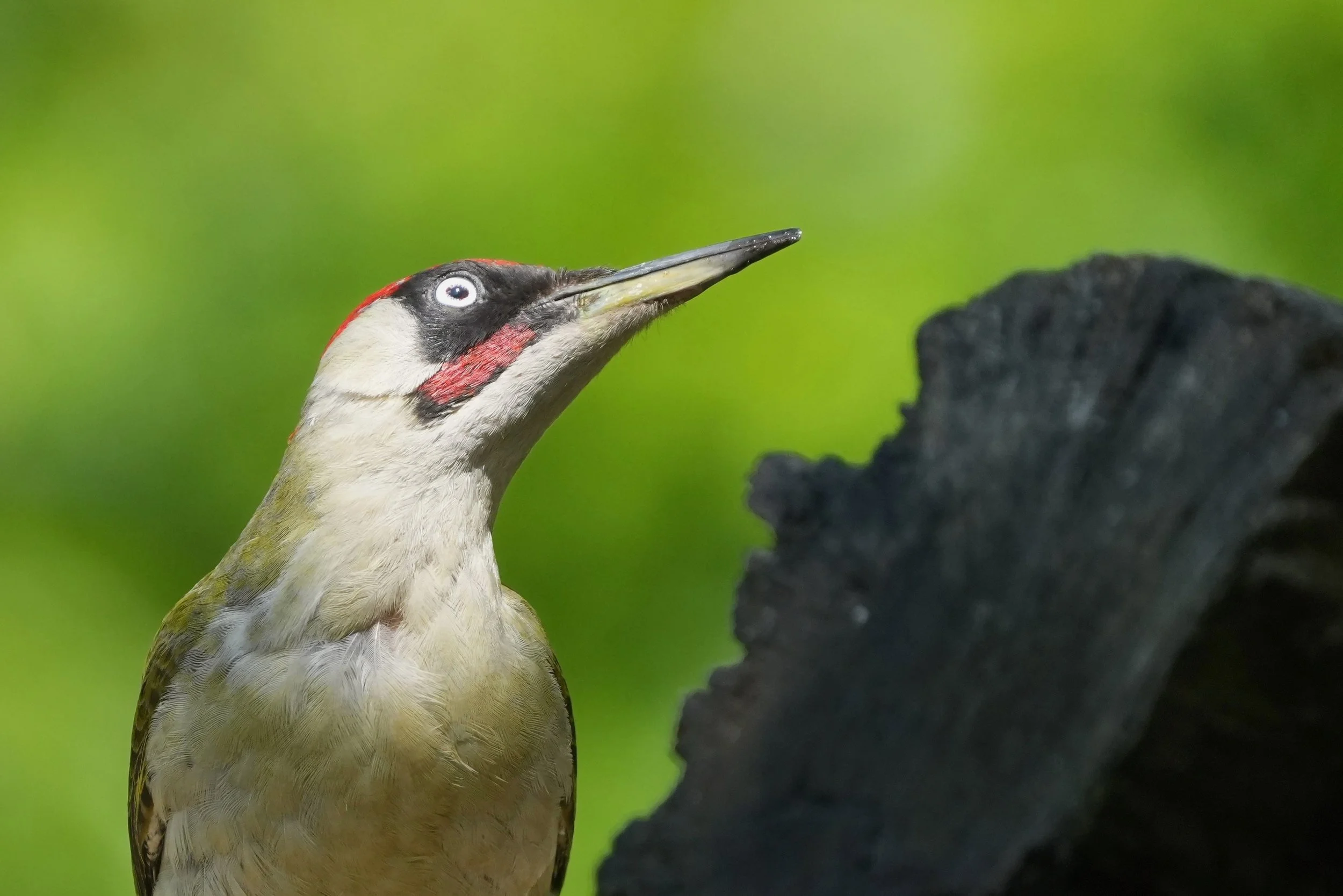 Als Erdspecht ist der Grünspecht ein Nahrungsspezialist. Auf seinem Speiseplan stehen ganzjährig Ameisen und deren Larven. Er kann seine klebrige Zunge bis zu einem Drittel seiner Körperlänge ausstrecken (ca. 10 cm), gezielt steuern und damit in Ameisenbauten eindringen. Eine harpunenähnliche Spitze ergänzt dieses “Spezialwerkzeug”. Das Schema zeigt die Aufhängung der Zunge im Ruhezustand, von der Schnabeloberbasis über Schädel und Schlund bis in den Schnabel.